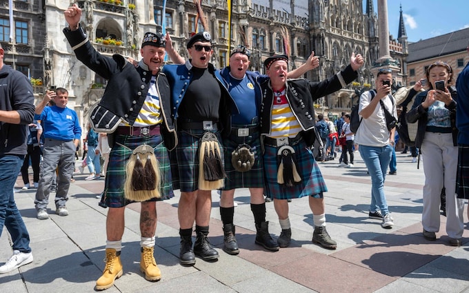 Tartan Army fans in Marienplatz. 'If there's no Scotland,there's no party',they saidCredit: Paul Grover/TelegraphOthers had taken over a business class flight from Dubai on their way here after a surprise upgrade saw several Scotland fans find themselves at the bar of an Emirates plane.“It’s been trains,planes and automobiles and now beer,” said one person on board,while his friend added: “I’m not sure I can put a price on this trip,don’t tell the wife.”They were sat next to Michael Wallace,41,who had taken son Evan,14,who was discreetly having a stein of Radler,and had travelled from Edinburgh via Stockholm,who added: “It’s a beer town,Scotland will drink its fair share of it. If there’s no Scotland,there’s no party.”Throughout the day locals were treated to Tartan Army lyrics including “Diego Maradona,he put the English OUT,OUT,OUT”,numerous renditions of the Proclaimers and endless versions of Flower of Scotland on the bagpipes.“We have every bit of hope about the game,” Stephanie Phinn,34,who was with her wife Lizzie,in her late 30s,and friends said.“These are better than we get in Glasgow,” she said as her wife and friends drank their latest stein. “Look around us,how good is this.”While the German football team may be less easy going tomorrow,locals were enjoying the company of this week’s tourists including Helmut Wanner,dressed in traditional German clothing,who decided to join in with the Scottish fans chants.“Kein Schottland,keine Party,” he said to the delight of those wearing blue and white around him.