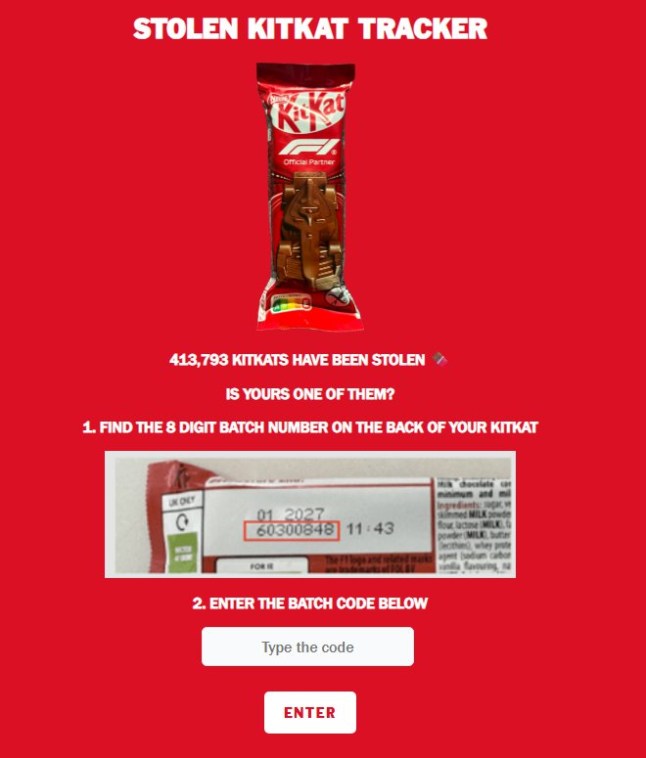 Start your day informed with Metro's News Updates newsletter or get Breaking News alerts the moment it happens.Jumping in on the action on Instagram,KitKat Canada quipped: ‘At least this shipment’s safe…’The clip showed one of brand’s distinctive lorries flanked with black vans on each side as well as ahead and behind it,with a driver of one security vehicle shown wearing dark sunglasses and talking into a radio.It was captioned with the line: ‘When the chocolate’s THIS good,you’ve got to call back up.’The video was released after Nestlé put out a humorous advert for ‘professional’ security guards,with the confectioner saying it was not ‘taking any more chances’.It said: ‘We’re seeking professional security guards with big break energy tojoin our team!’The advert adds that candidates must have ‘extensive’ experience in guarding ‘high-value,high-profile assets’.KitKat have also said they are looking to hire security guards to help protect ‘high-value,high-profile’ assets (Picture: Shutterstock)And,in another clever pun,they must have share a passion for both ‘taking breaks’ and ‘preventing break-ins’.‘Precious cargo needs protecting’,the notice finishes.The stolen lorry remains untraced,as Nestlé says it continues to work with local authorities and suppliers to track the missing shipment.Shops and treat lovers can use the unique batch code on their bar to see if it was bought on the black market.A ‘stolen KitKat tracker’ has been set up online for consumers and retailers to check their treat’s origins.The Swiss-based confectionery giant praised the thieves’ ‘exceptional taste’ but,on a more serious note,called on governments to do more to tackle retail fraud.Nestlé has set up an online stolen KitKat tracker for shoppers to check their bars (Picture: stolen KitKat Tracker)It said in a statement following the theft: ‘We’ve always encouraged people to have a break with KITKAT – but it seems thieves have taken the message too literally and made a break with more than 12 tonnes of our chocolate.‘Whilst we appreciate the criminals’ exceptional taste,the fact remains that cargo theft is an escalating issue for businesses of all sizes.‘With more sophisticated schemes being deployed on a regular basis,we have chosen to go public with our own experience in the hope that it raises awareness of an increasingly common criminal trend.’Get in touch with our news team by emailing us at .